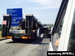 Колонна российских танков движется по трассе по направлению в Евпаторию. Сообщение об этом, равно как и собственноручно сделанные фотографии военной техники, мне прислала украинка Наталья, недавно приехавшая в оккупированный Крым.