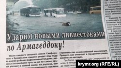 «Крымские известия» в материале «Ударим ливнестоками по Армагеддону» пишут о том, что после сильных ливней Симферополь уходит под воду: во многих районах подтапливаются дома, легковые автомобили чуть ли не по самые крыши утопают в мутной жиже; а на дорогах, особенно в районе железнодорожного вокзала, возникают ДТП.