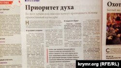 «Крымская газета» в материале «Приоритет духа» пишет о том, что во всех школах полуострова начнут преподавать основы православной культуры. По информации издания, такой предмет появился в расписании некоторых крымских школ еще в 2003 году. Преподают его пока не везде и с согласия родителей в рамках внеурочной деятельности. «На первом съезде, прошедшем в прошлом году, приняли несколько важных решений, которые касались преподавания основ православной культуры в Крыму, – рассказал подконтрольный Москве глава Крыма Сергей Аксенов. – Сейчас уже проведена большая работа и созданы условия для преподавания этого важного предмета. В том числе изданы десять тысяч экземпляров учебного пособия по основам православной культуры, которые переданы в школьные библиотеки, разработаны соответствующие школьные программы». Всего в Крыму основы православной культуры изучают чуть больше 4 тысяч юных крымчан. Еще более 2 тысяч школьников изучают основы исламской культуры и основы мировой религии.