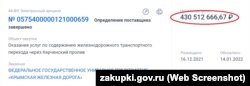 В начале января Федеральное государственное унитарное предприятие «Крымская железная дорога» закупило услуги по содержанию железнодорожного транспортного перехода через Керченский пролив. Начальная стоимость услуг определена в сумме 430,5 миллионов рублей, сообщается на российском портале госзакупок. Но в ходе торгов была уменьшена до 428 миллионов рублей.