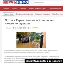 Руководители сайта «КерчьИнфо» заявили, что получили телефонные звонки от представителей российской власти Крыма с угрозами и обвинениями. Это произошло после появления на сайте публикации о последствиях потопа в городе и с критикой властей, а также попытки редакции защитить свой контент от несанкционированного использования провластным государственным телеканалом «Крым 24».