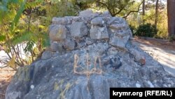 Одно из граффити привлекает внимание издалека: на каменном основании желтой краской нарисован герб Украины. Не исключено, что герб нарисовали представители общественного движения «Желтая лента», активисты которого распространяют украинскую символику на временно оккупированных территориях.