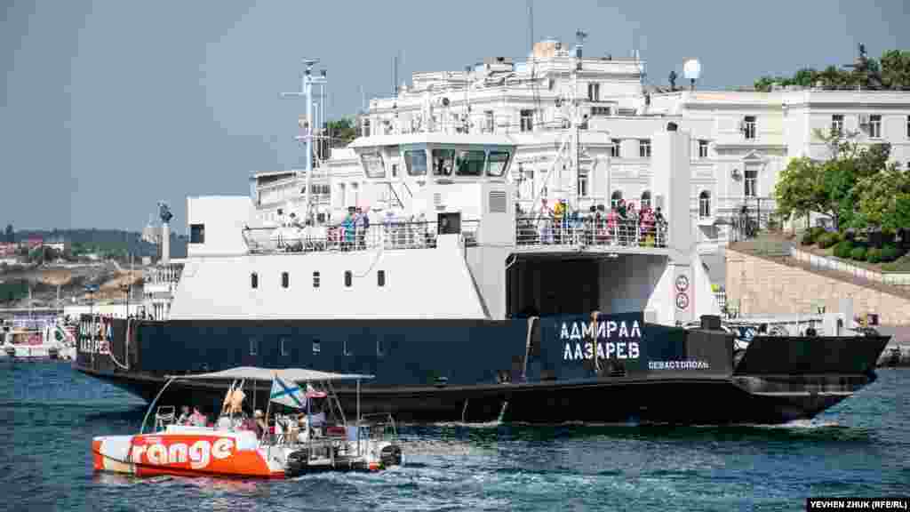 Артиллерийская бухта находится на Гераклейском полуострове в Севастополе. По бухте движутся паром «Адмирал Лазарев» и прогулочный катер.