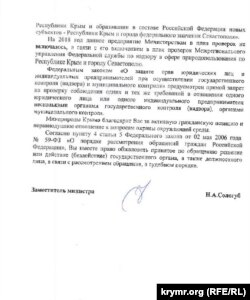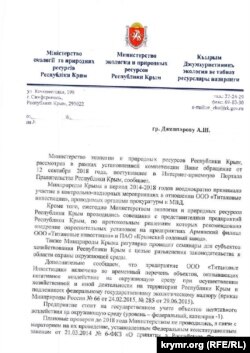 «Плановые проверки до 2018 года министерством не проводились в связи с мораторием на их проведение, установленным Федеральным конституционным законом от 21.03.2014 №6-ФКЗ «О принятии в Российскую Федерацию Республики Крым и образовании в составе Российской Федерации новых субъектов – Республики Крым и города федерального значения Севастополя». На 2018 год данное предприятие («Крымский титан» – КР) министерством в план проверок не включалось в связи с его включением в план проверок Межрегионального управления Федеральной службы по надзору в сфере природопользования по Республике Крым и городу Севастополю», – сообщили в ответе на запрос правозащитника.