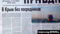 «Крымская правда» в статье «В Крым без посредников» сообщает об открытии грузового движения по мосту через Керченский пролив. «Событие важное и ожидаемое. Более всего о нем грезили дальнобойщики, вынужденные тратить уйму времени на паромной переправе. Даже при самом благоприятном стечении обстоятельств на форсирование Керченского пролива необходимо было потратить сутки. Переправа в оба конца обходилась почти в 40 тысяч рублей (около 17 тысяч гривен – КР). Кроме того, надо было платить водителям командировочные и суточные за вынужденный простой», – пишет газета.