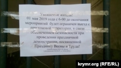 Как рассказали корреспонденту Крым.Реалии жильцы одного из домов на проспекте Нахимова, с утра на воротах появилось объявление от имени управляющей компании, которая обслуживает дом. В объявлении сообщали, что «1 мая с 6:00 до окончания мероприятий будет ограничен выезд с придомовой территории, в связи с обеспечением безопасности при проведении праздничной демонстрации, посвященной празднику Весны и Труда».