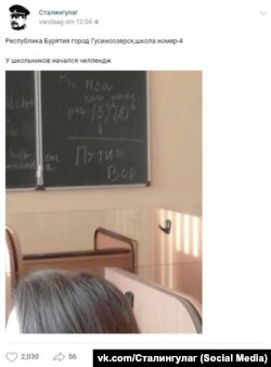 Ученики одной из школ Бурятии открыли в среду 14 ноября флешмоб фотографией, изображающей надпись "Путин – вор" на школьной доске, сообщает русская служба Радио Свобода.