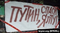 Участники митинга повесили на забор большой плакат с надписями «Путин, спаси Ялту!» и лозунгом «Генплан = дерибан».