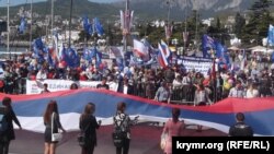 В шествии приняли участие городские бюджетные предприятия и организации, трудовые и творческие коллективы, сотрудники подконтрольных Кремлю администрации и городского совета Ялты.