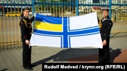 Право поднять флаг Военно-морских сил Украины (ВМСУ) было предоставлено курсантам-отличникам: Денису Григоруку и Кириллу Торубаре.