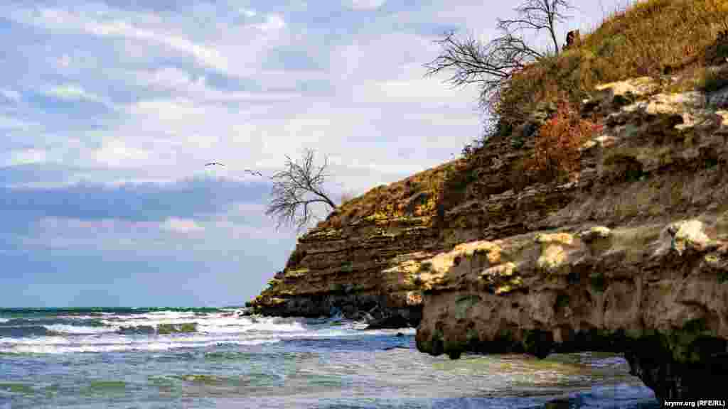 Обрывистый берег нависает над пляжем села Каменское (Ак-Монай – до 1945 года) Ленинского района. Село находится в северной части побережья Арабатского залива. Он получил название от построенной у начала Арабатской стрелки крепости, которая сохранилась в полуразрушенном состоянии.