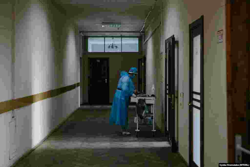 Врач в спецкостюме проходит по недавно открытому отделению для больных COVID-19