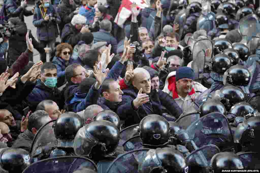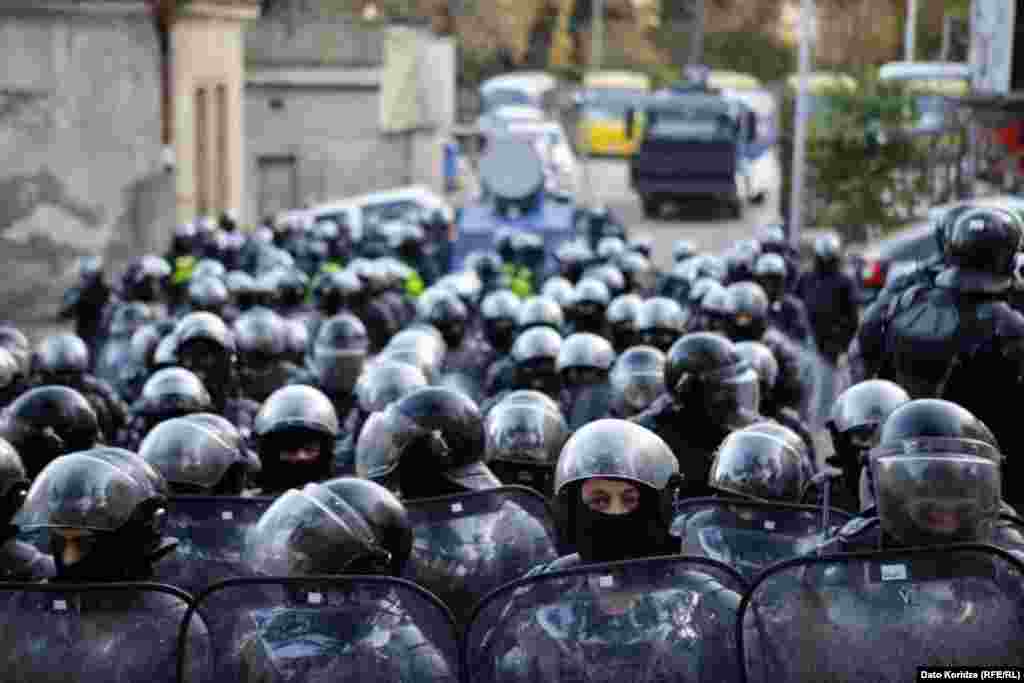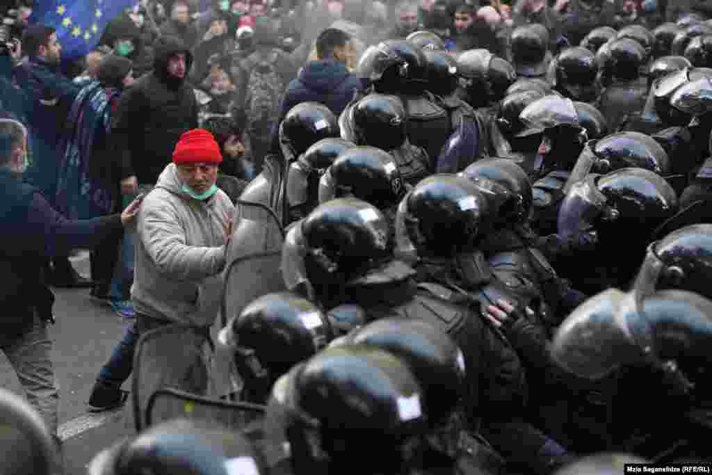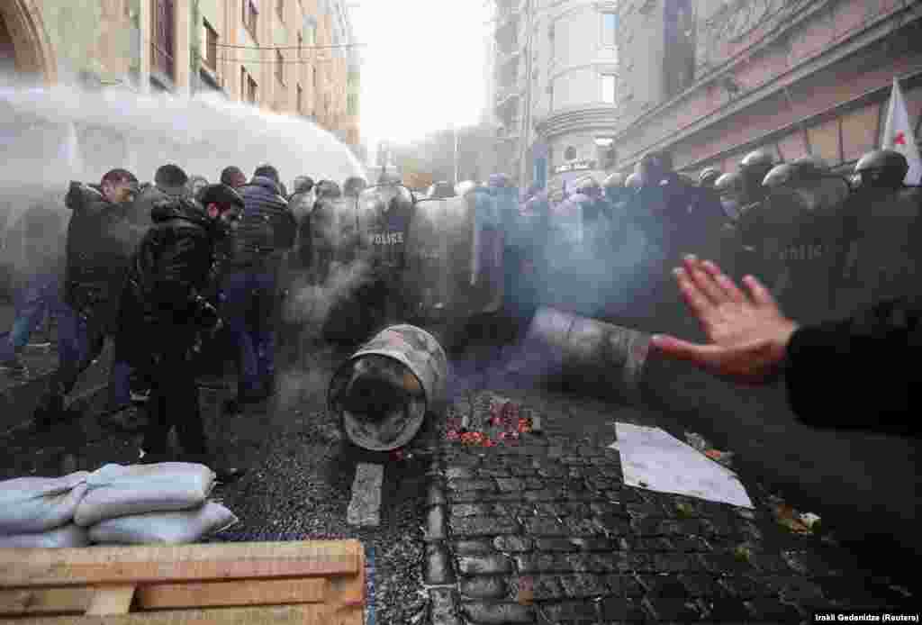 Вечером в понедельник, 18 ноября, полиция начала применять силу против митингующих – в ход пошли водометы. Построившись в плотные ряды, спецназовцы толкали пикетчиков щитами. Постепенно спецназ очистил все улицы, разблокировал входы в парламент и освободил от палаточного городка центральный проспект Руставели.